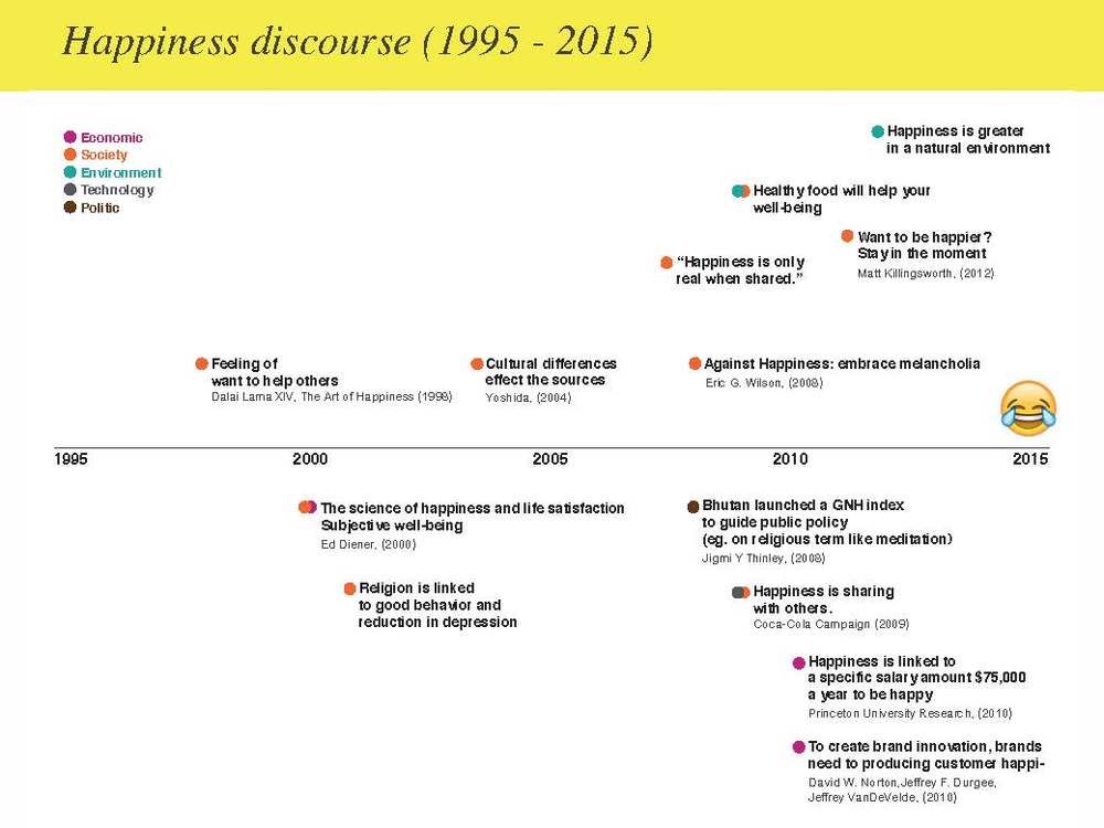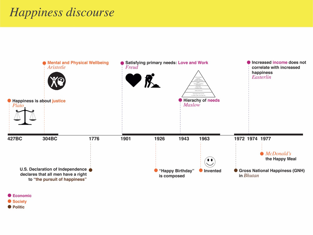 Discourse analysis is looking to all discursive arguments or behaviours or practices that construct or frame the way people think and act within a specific context, society and timeframe. In this project, we looked into the discourse of happiness. We analyse how people have been thinking and defining happiness, how they have been acting upon their belief of happiness from the past to present. We recognise the patterns of how 'happiness' has been changing through the authorities, institutions, practices and objects involved in the discourse. Then we tend to see the key drivers of how 'happiness' could be in the futures, how people could change the way people thought, see, behave and express their happiness in the next twenty years time.